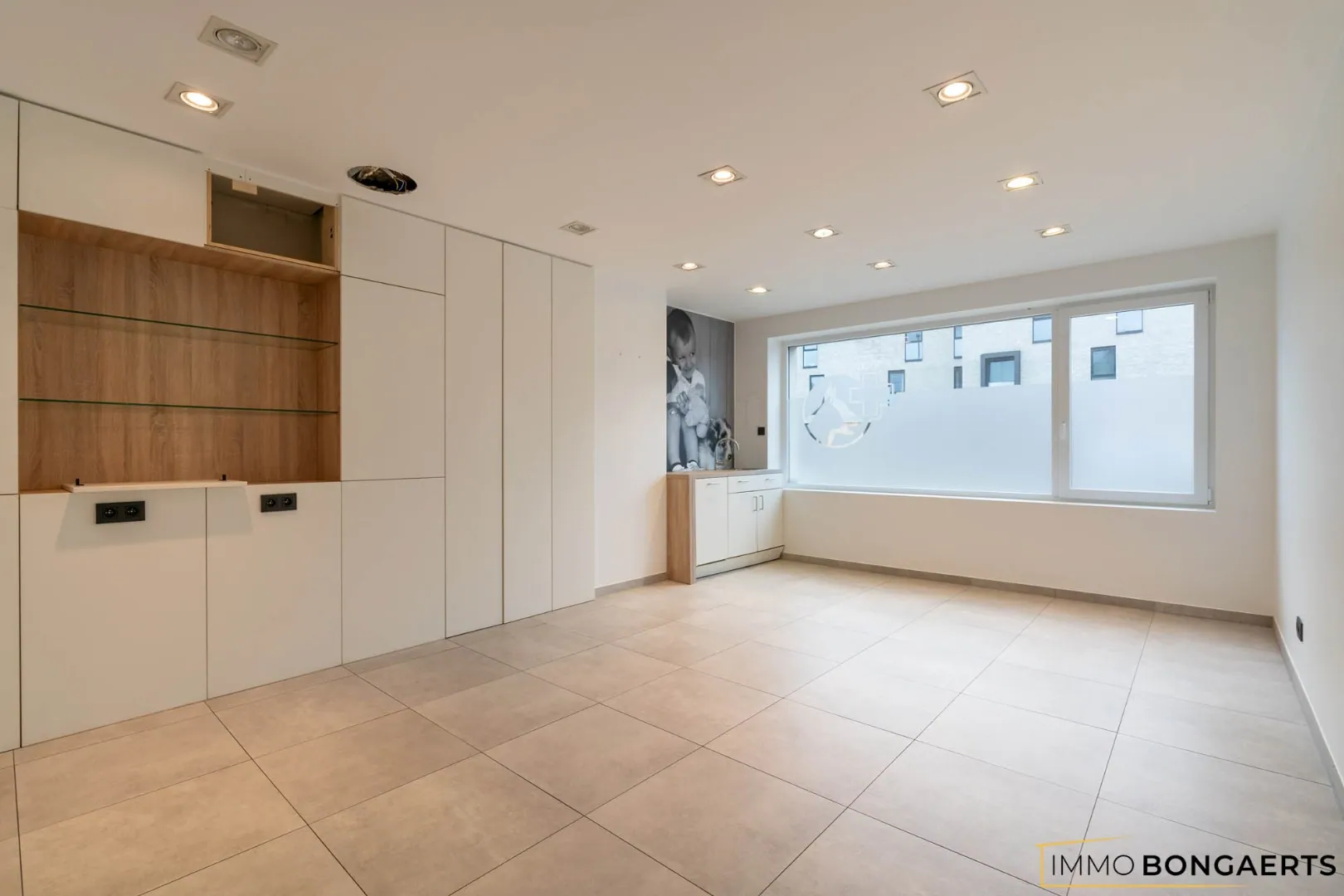 De handelsruimte op het gelijkvloers werd in 2018 volledig gerenoveerd. Dit commercieel gedeelte is opgedeeld in een wachtruimte, een apart toilet en drie ruime werkplaatsen. Aansluitend vinden we aan de achterzijde nog een keuken, een badkamer en een tweede toilet.