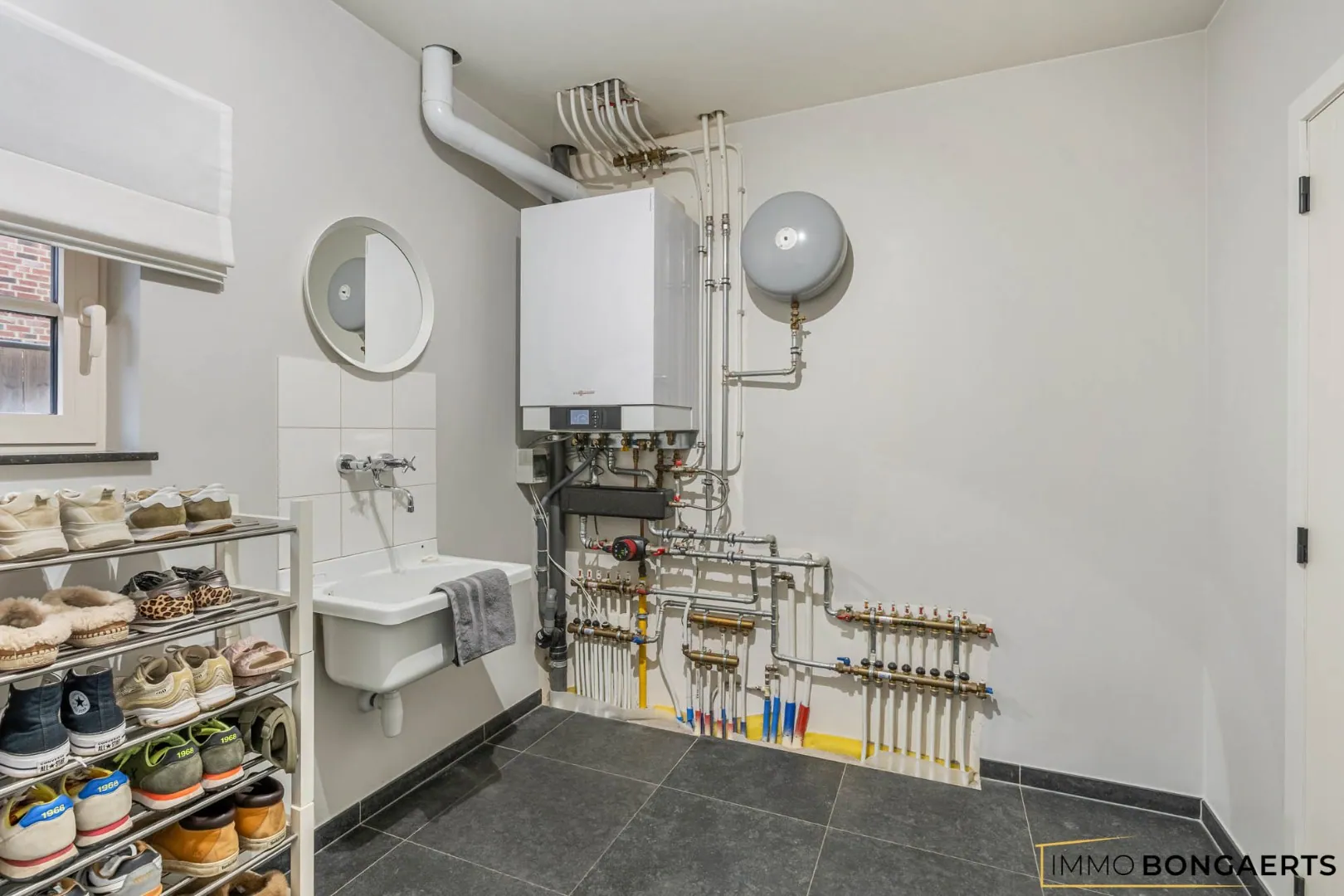 Verder vindt u op het gelijkvloers de achterinkom met vestiaire, een functionele berging/wasplaats en een polyvalente ruimte die gebruikt kan worden als bureel, speelkamer of extra slaapkamer.