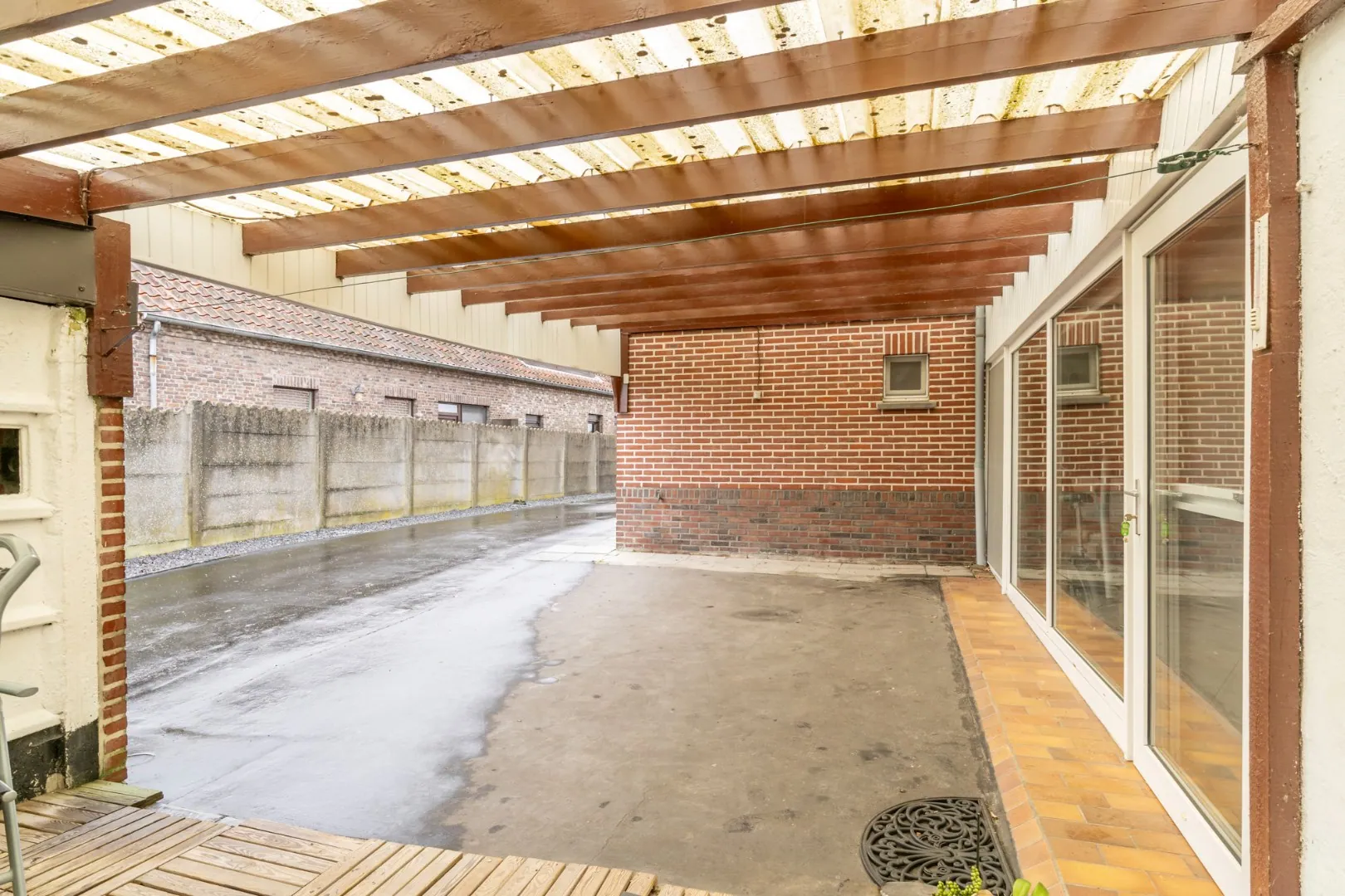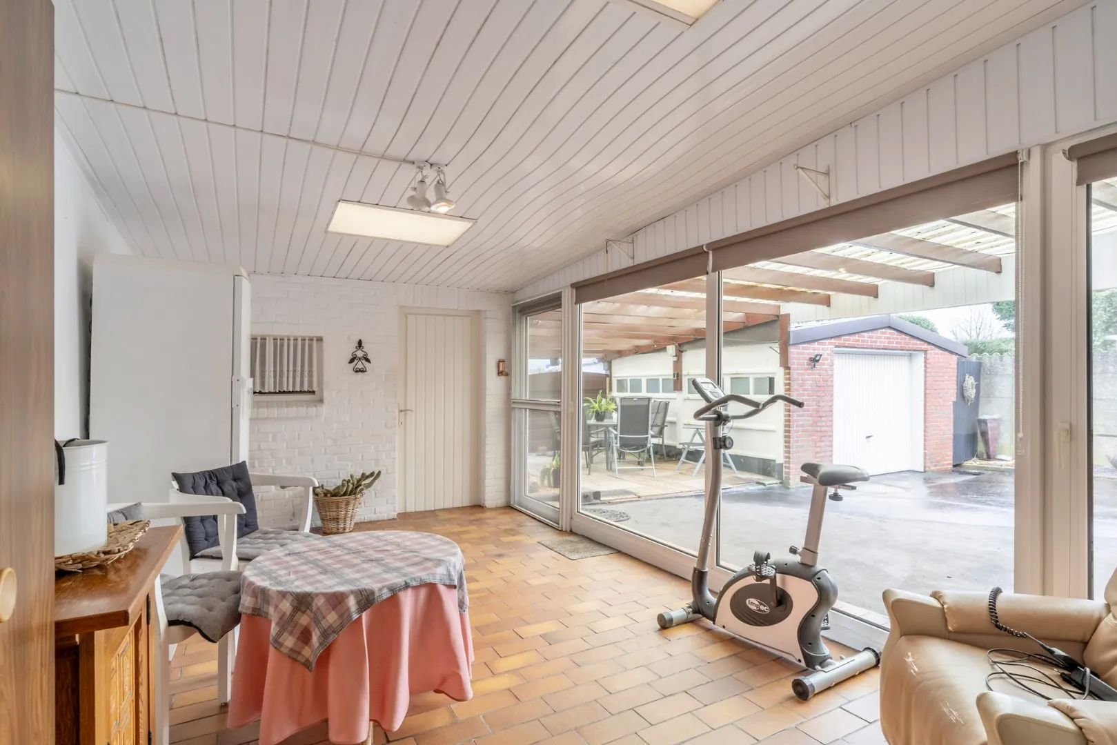 Inkomhal, woonkamer, eetkamer, keuken, badkamer, veranda en berging.