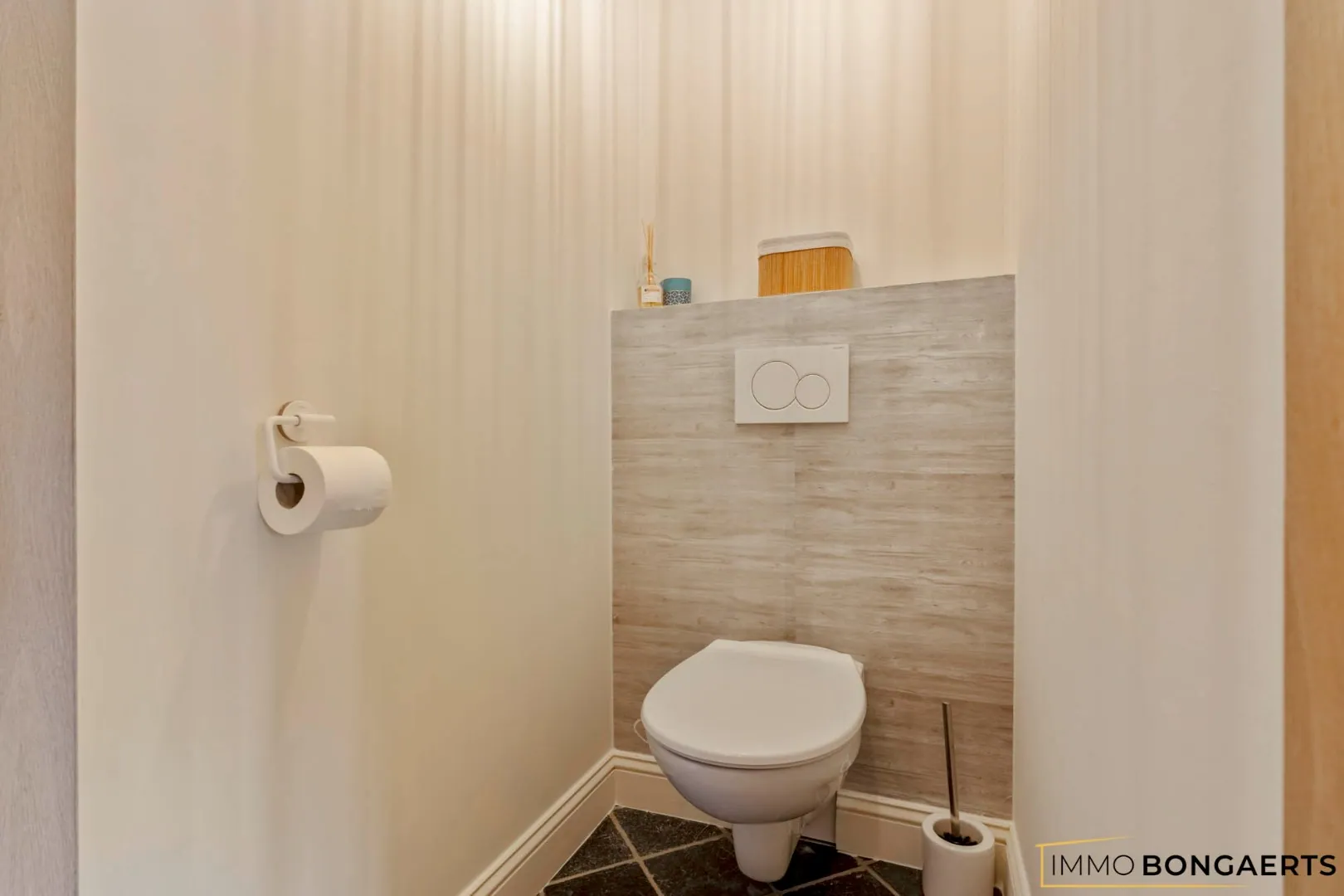 Inkomhal, gastentoilet, leefruimte met open keuken en berging/wasplaats.