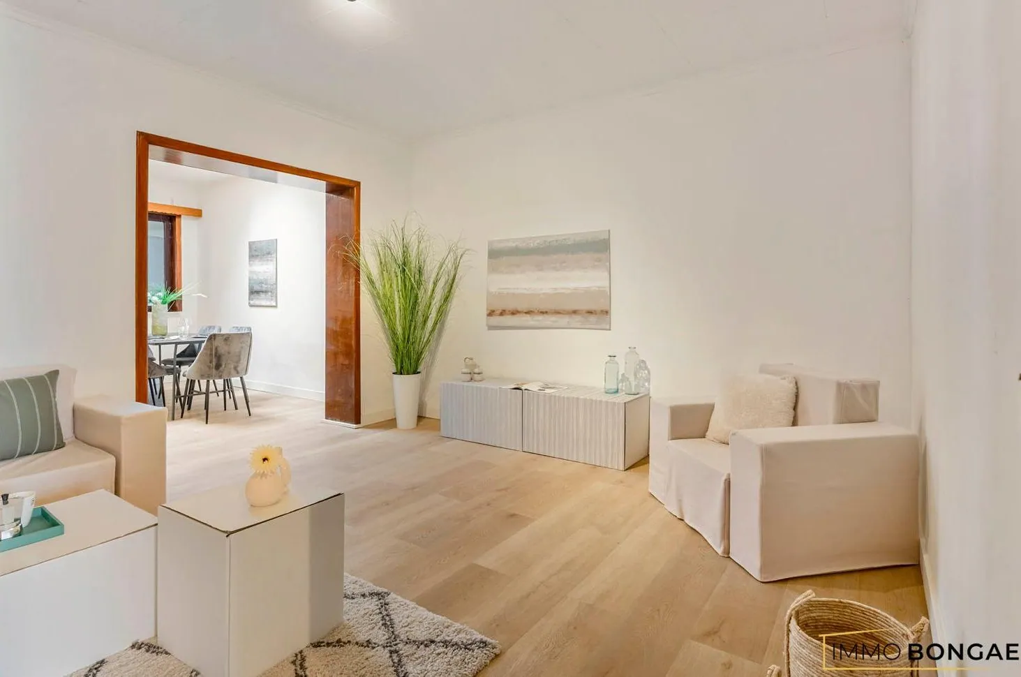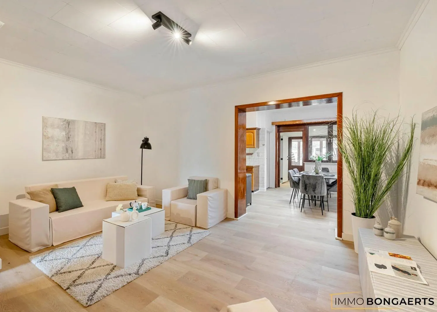 Bij het binnenkomen valt meteen de ruime, gezellige leefruimte op. Deze leefruimte sluit harmonieus aan op de praktisch ingerichte keuken met eethoek, wat zorgt voor een open en huiselijk gevoel.