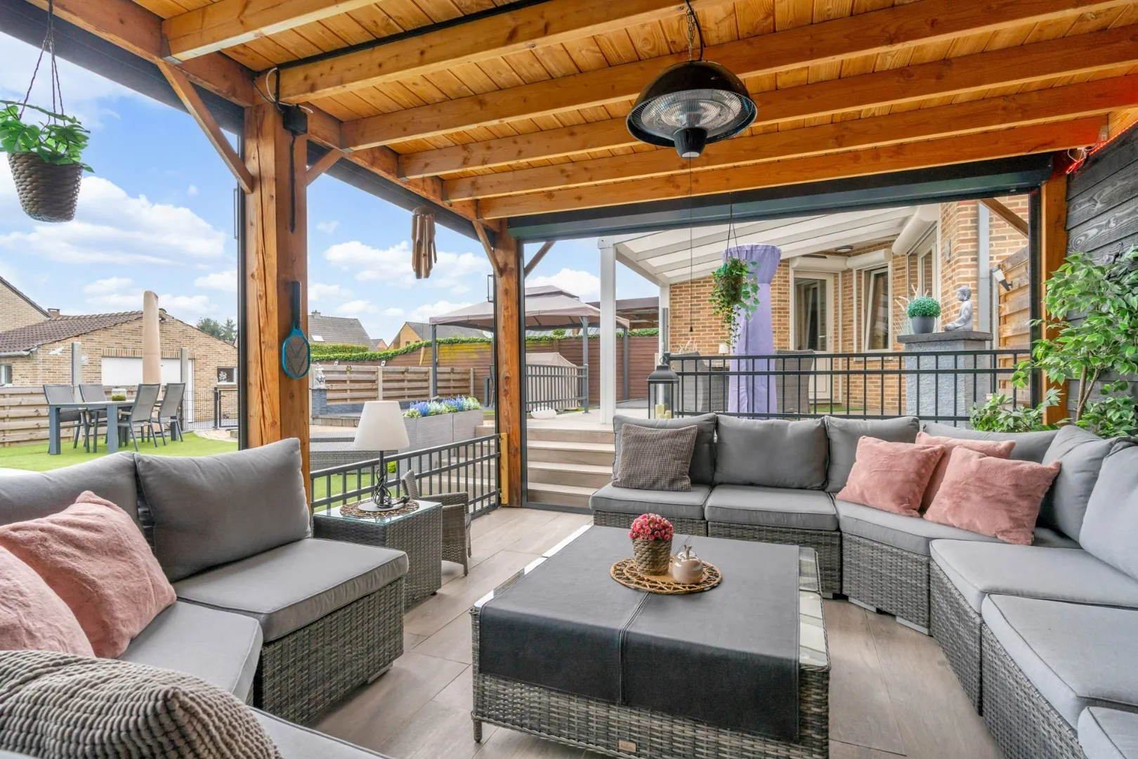Bij het betreden van de woning valt meteen de ruime en lichte woonkamer op. Met een bewoonbare oppervlakte van 160m² is er voldoende ruimte om te ontspannen en te genieten van het gezinsleven. De grote ramen laten veel natuurlijk licht binnen en bieden een prachtig uitzicht op de goed onderhouden tuin.